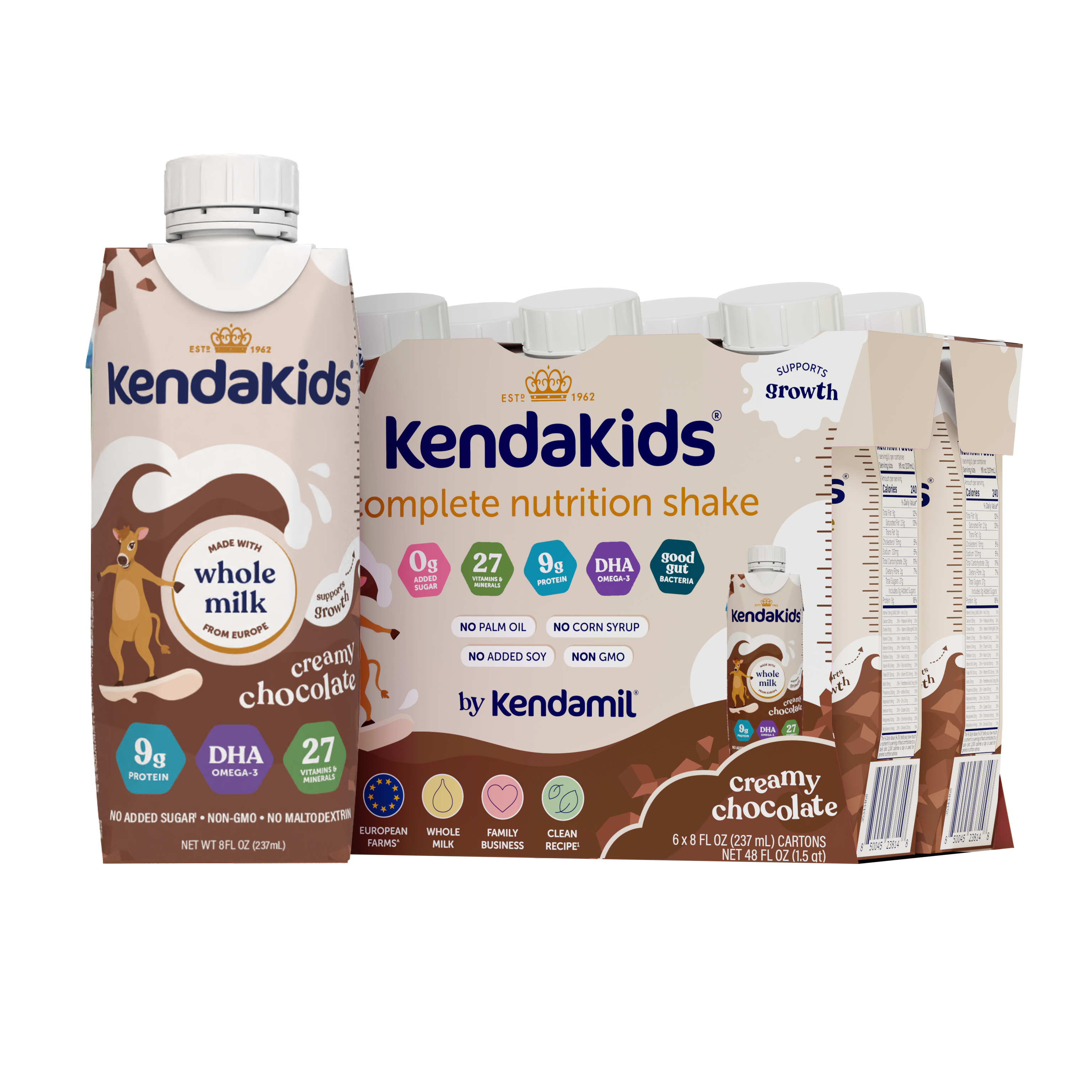 KendaKids Vita-Boost Shakes are made with European whole milk from grass-fed cows raised on family farms. Each shake is enriched with 27 essential vitamins and minerals, delivers 9g of protein, 32g of plant-based DHA Omega-3s, and a unique blend of prebiotics and postbiotics to support immune function, muscle growth, brain development, and gut health. Good milk fats further support your kids’ growing brain, while Vitamin D helps boost calcium absorption for strong bones and teeth. And the best part? They’re free from added sugars, syrups, artificial flavors, and colors. Every sip delivers the natural goodness your child needs- and nothing they don’t.